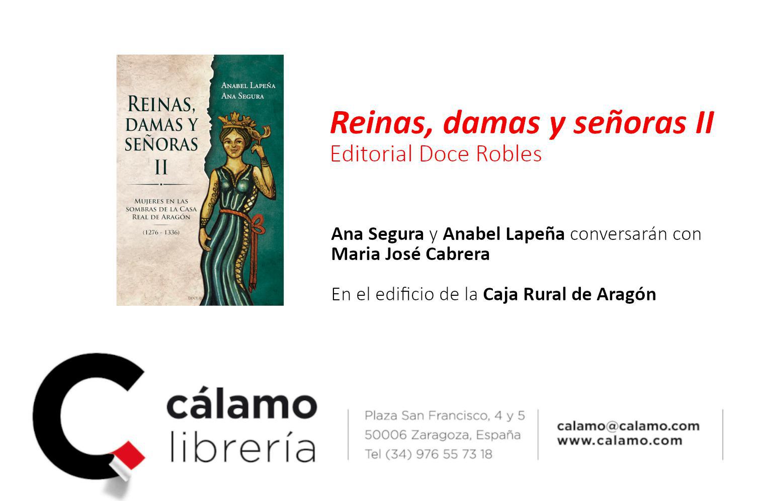 Las autoras Ana Segura y Anabel Lapeña nos invitan a un encuentro literario en Zaragoza para presentar su nuevo libro, "Reinas, damas y señoras II. Mujeres en las sombras de la Casa Real de Aragón 1276 - 1336", publicado por Editorial Doce Robles. Esta imprescindible cita tendrá lugar en el Edificio de la Fundación Caja Rural, donde conversarán con María José Cabrera.