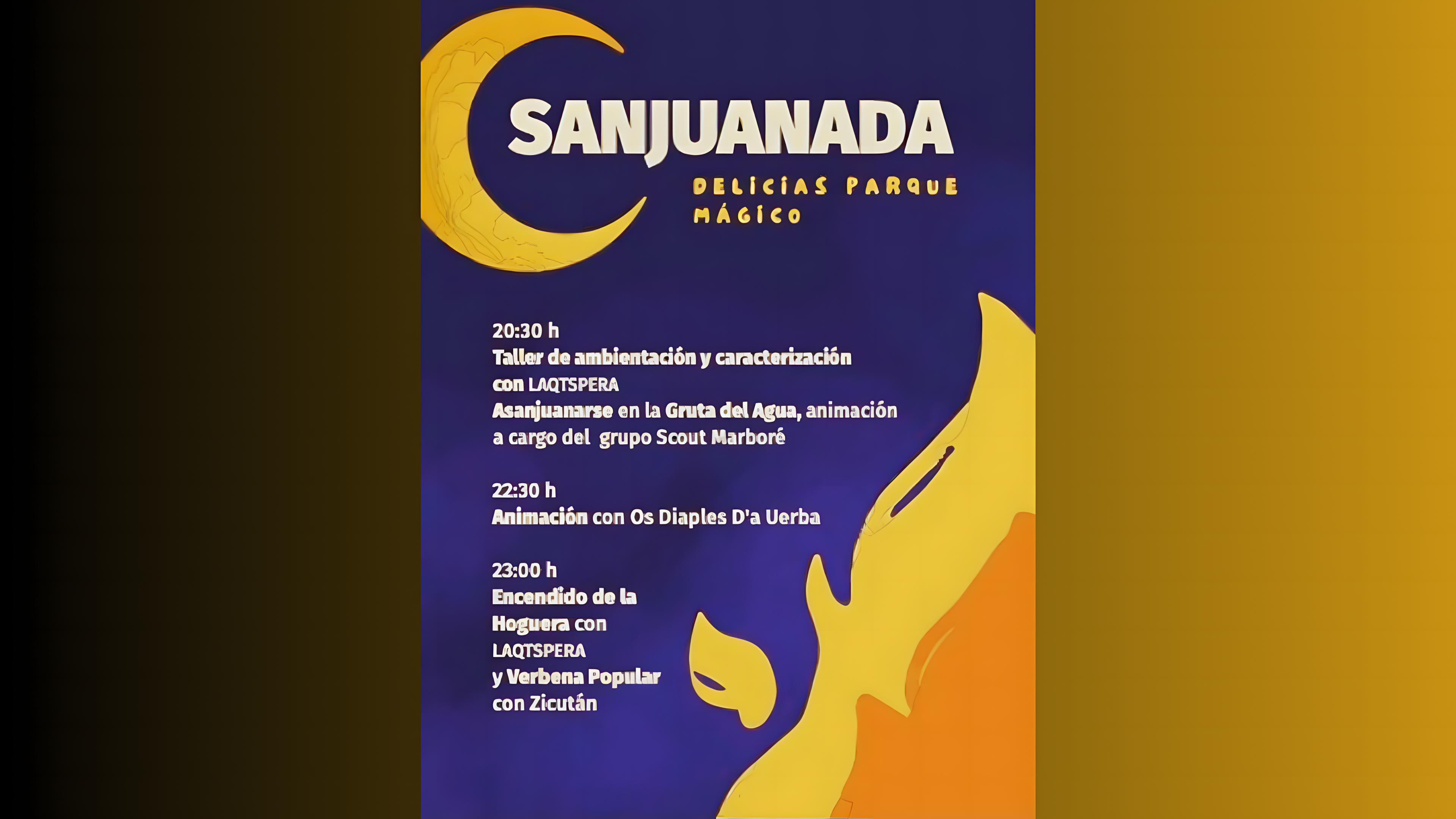 La programación está pensada para todas las edades y comienza con un taller de caracterización para todos los públicos a cargo de LQTSPERA. La celebración continúa con un ritual simbólico en la Gruta del Agua y el impresionante espectáculo de fuego de Os Diaples d’a Uerba. El punto culminante de la noche será el encendido de la hoguera, seguido de una animada verbena popular con ZICUTÁN.