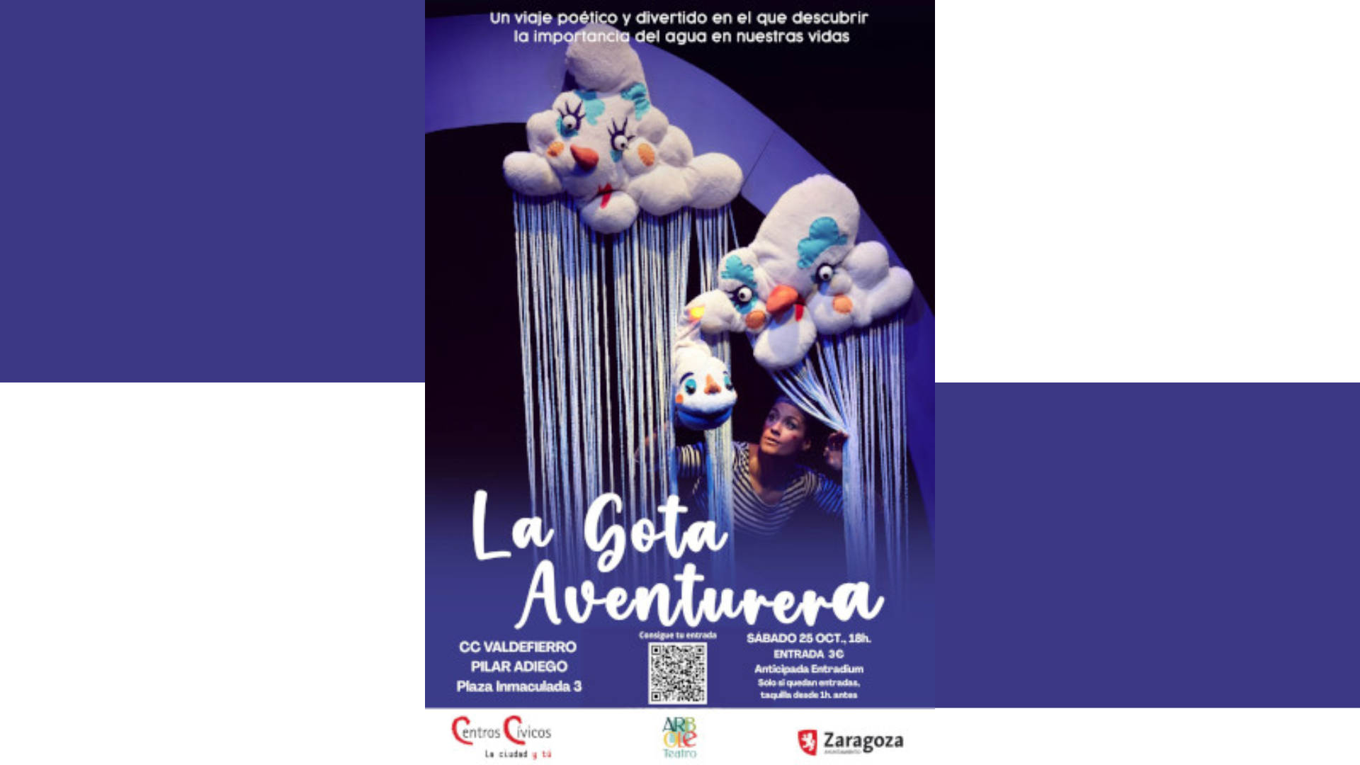 El Centro Cívico Valdefierro Pilar Adiego presenta "La Gota Aventurera", un espectáculo del aclamado Teatro Arbolé dirigido a público familiar a partir de 2 años. 👶